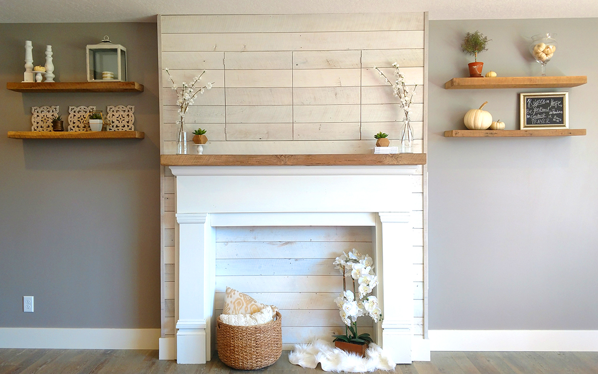 This faux fireplace uses all reclaimed wood materials and includes a couple hidden surprises. This particular fireplace mantel was found in an old barn which we refinished and then fastened a reclaimed oak plank on the top. The back wall is reclaimed shiplap planking given a white wash finish. The original idea was to mount a TV screen above the mantel, but we also wanted to retain a more elegant look at times by just showing the shiplap planking. This was accomplished by running the boards all the way across and making two doors which would allow the TV screen to be hidden when not in use. There was also a hidden access door built into the side of the fireplace to house all the components.